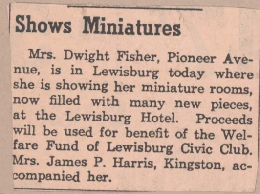 A Photograph of a Newspaper Clipping Advertising the Showing of Mrs. Fisher's Dollhouse at the Lewisburg Hotel for their Civic Club.