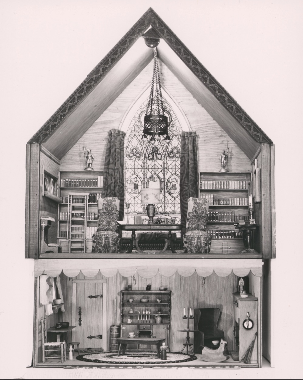 The photograph depicts a black and white render of the third iteration and addition Mrs. Fisher made to her dollhouse, the Early American Kitchen and Gothic Library.