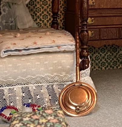 The image depicts a brass foot-warmer Mrs. Fisher placed at the foot of the canopy bed in the colonial room of the Dollhouse.