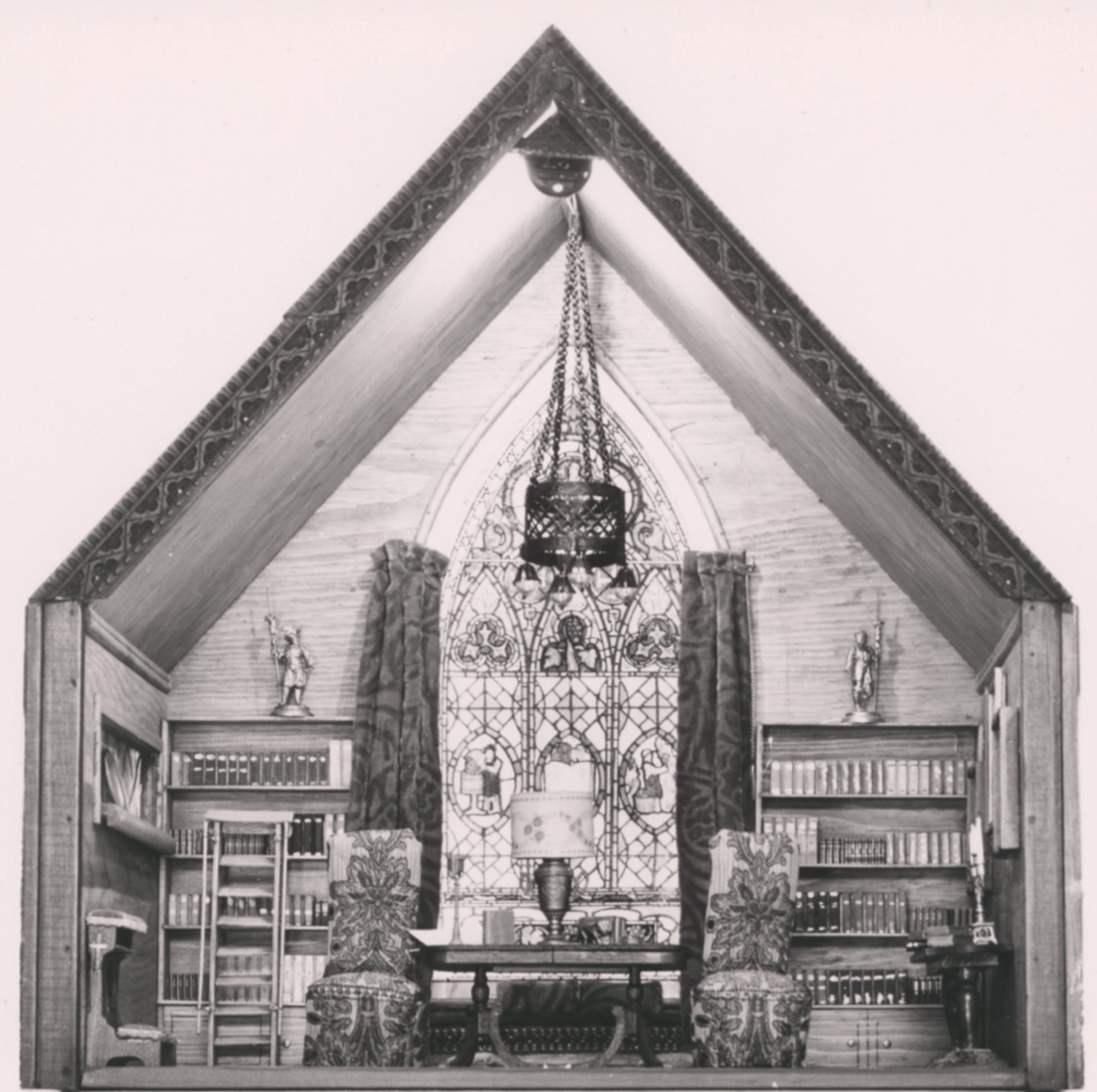 The image shows a black and white photograph of the Gothic Library in Mrs. Fisher's dollhouse miniature.