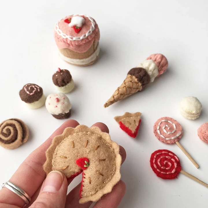 The image shows a handful of sweet treats made miniature from felt.